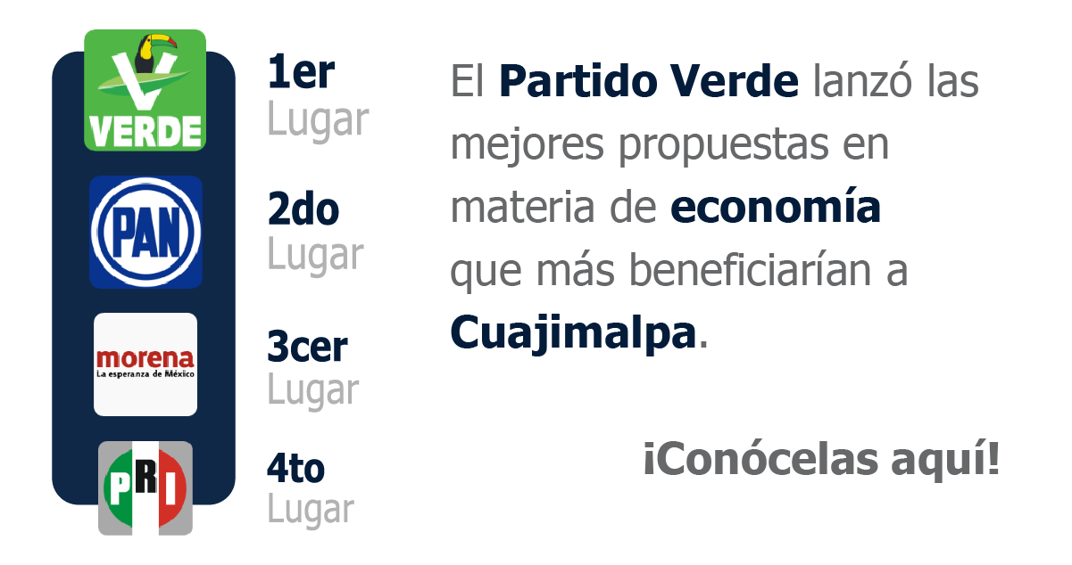 junio 4,11:33 AM By Mexico a Detalle El Partido Verde lanzó las mejores propuestas en materia de economía que más beneficiarían Cuajimalpa. ¡Conócelas aquí